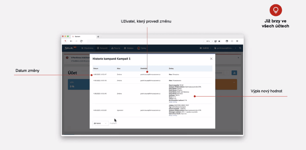 Sklik spustil Historii změn, zatím v betě, která byla oznámena v srpnu. Ta v účtu umožňuje zobrazit přehled všech úprav provedených u kampaní a sestav. Najdete zde informace o tom, jaké změny byly provedeny (například vytvoření, pozastavení, změna stavu, úprava max. CPC), kdy k nim došlo a kdo je provedl.