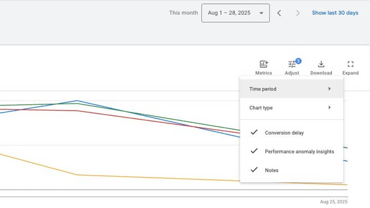 Google představil nové funkci v rámci tlačítka Upravit (Adjust) v grafech na přehledech v online rozhraní. Dosud nabízelo jen nastavení časového období či typ grafu viz screen níže.