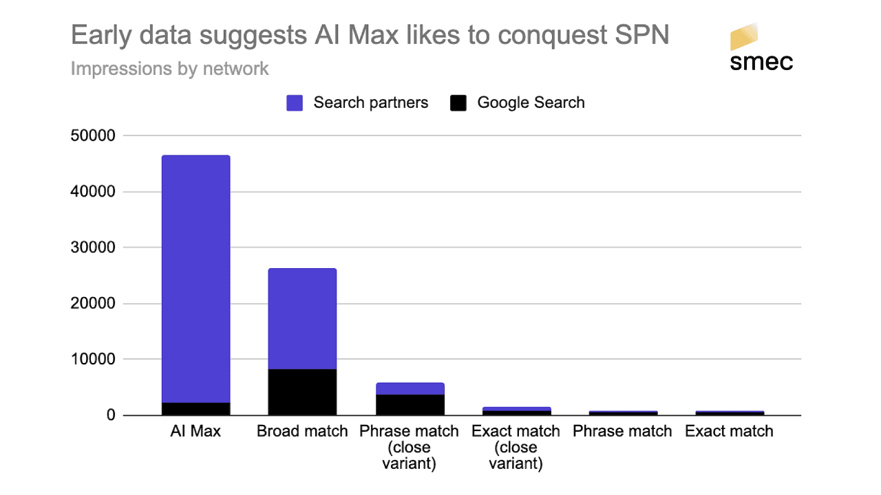 Mike Ryan sdílel data z kampaně, která naznačují, že AI Max se ve SPN rozšiřuje přehnaně, s vyšším podílem reklam než u jiných kampaní. Doporučil inzerentům zvážit vypnutí SPN.