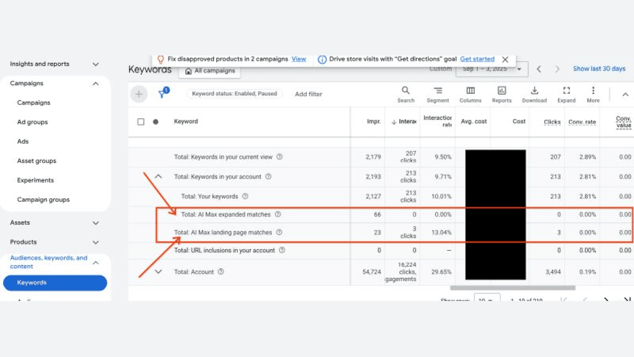 - Metrika AI Max expanded matches zaznamenává návštěvnost z broad match klíčových slov generovaných pomocí AI Max.
