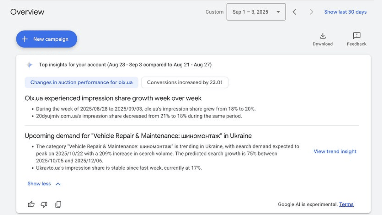Google Ads přidal novou funkci AI na stránce Přehledy, která identifikuje, kteří konkurenti jsou více vidět za posledních 7 dní v porovnání s předchozím obdobím, a zároveň předpovídá sezónní nárůsty poptávky po službách. Tuto aktualizaci sdílel Vyacheslav Terentiev.