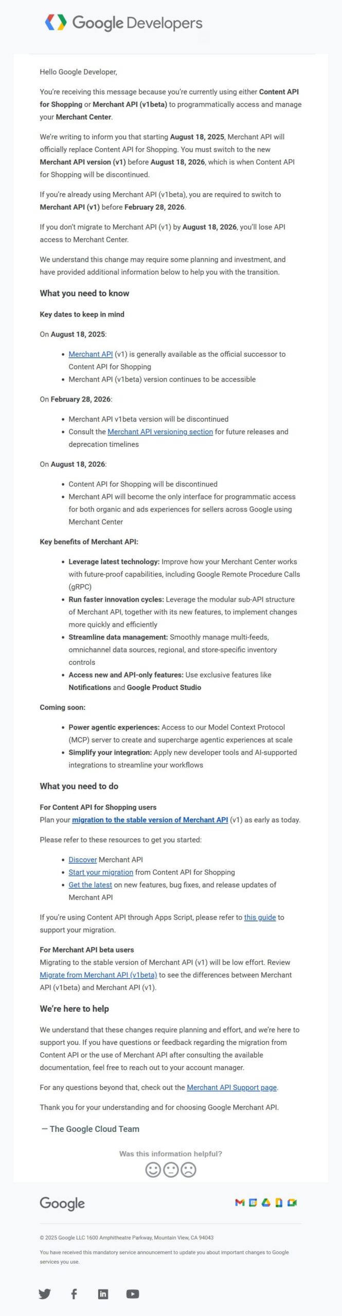 Google začal rozesílat e-maily inzerentům, kteří používají Content API for Shopping nebo Merchant API v1beta, aby je informoval o termínech ukončení podpory a pobídl k včasné migraci.