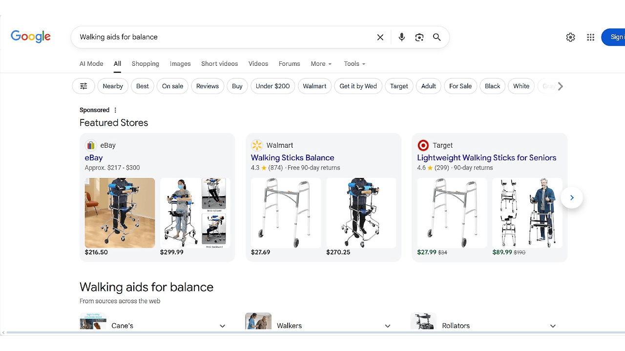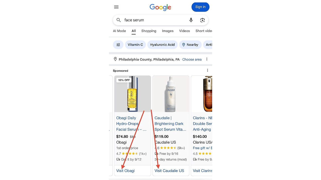 Google nyní zobrazuje tlačítko „Visit Store“ přímo v Shopping ads. Nové CTA je umístěno ve spodní části reklamní jednotky a zdůrazňuje název obchodu. Slovo „Visit“ je následováno názvem obchodu, například „Visit Nike“ nebo „Visit Sephora“, což činí výzvu k akci více personalizovanou a značkově specifickou.