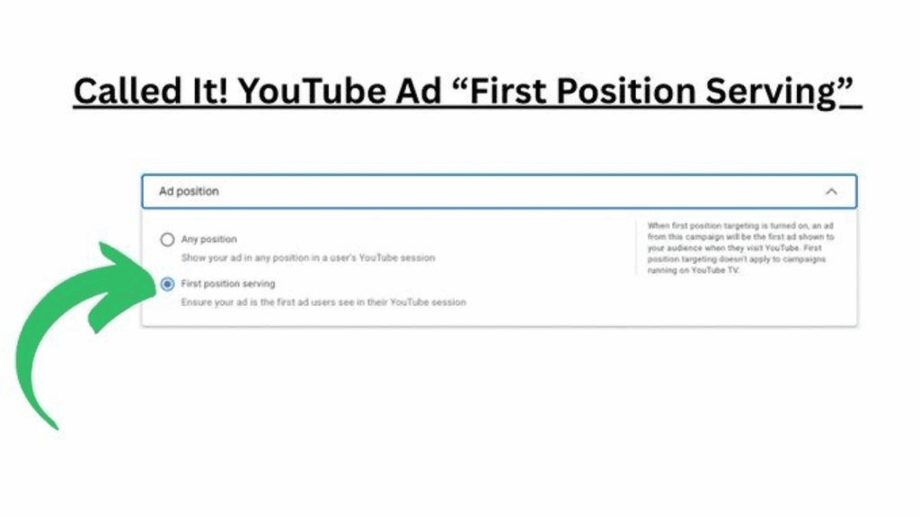 Pro video reklamy bylo zavedeno nové nastavení „First Position Serving“, které inzerentům umožňuje zobrazit jejich reklamu jako první v reklamní sekvenci na YouTube. Tato funkce značkám pomáhá získat větší pozornost diváků a sledovaný čas. Cenový rozdíl mezi první pozicí a jakoukoli pozicí zatím není jasný. Na tuto aktualizaci upozornil Anthony Higman.