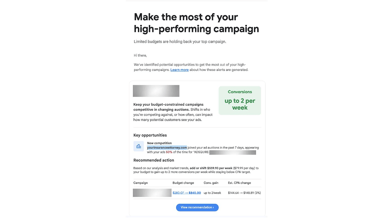 Anthony Higman zaznamenal další pokus Googlu o zvýšení rozpočtů kvůli údajným “konkurentům” v aukci. Zpráva je ale poněkud matoucí, protože zmínění konkurenti nejsou vidět v přehledu Analýza aukce. V době rostoucího využití automatizace poháněné AI nemusí být tyto automatické hlášení vždy přesná. Inzerenti by měli před úpravami rozpočtu ověřit údaje v Analýze aukce, zda je konkurence skutečně přítomná.