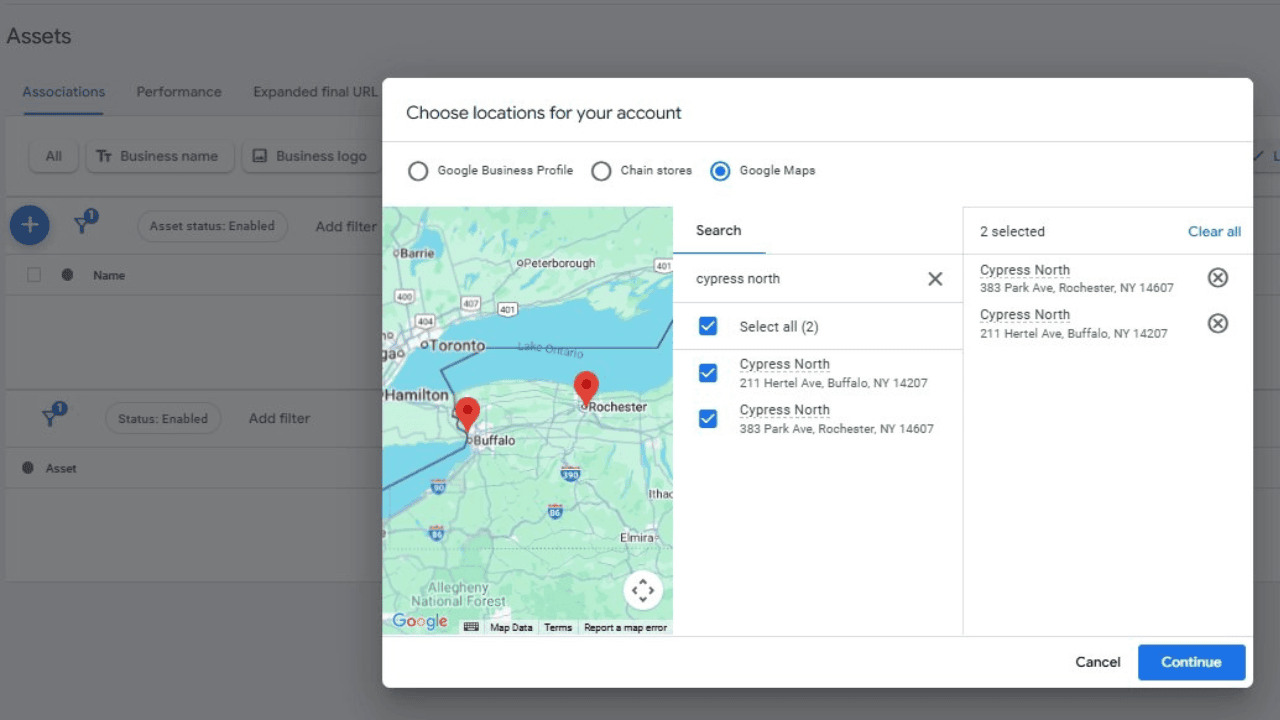 Inzerentům je nově nabídnuta možnost vybírat až 10 obchodních lokalit přímo z Google Maps při nastavování rozšíření o lokalitu. Tato nová funkce představuje alternativu k propojení s Google Business Profile nebo místy obchodních řetězců.