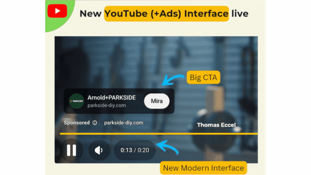 YouTube testuje moderní reklamní rozhraní s novým vzhledem. Hlavní aktualizace zahrnují velké a dobře viditelné tlačítko s výzvou k akci a modernizovaný ukazatel průběhu, který zlepšuje jasnost trvání reklamy. Novinku sdílel Thomas Eccel.
