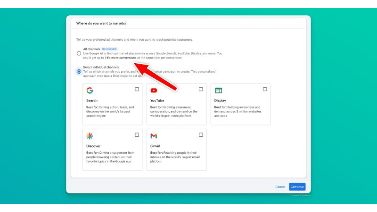 Druhý test rovnou nechal uživatele vybrat jednotlivé kanály, kde by chtěl svou reklamu zobrazit (bez možnost všech sítí), a to Search, Display, YouTube, Discover nebo Gmail. Pozoruhodné je, že vytvoření kampaně Standard Shopping nyní vyžaduje výběr sítě Search. Shopping již není nabízen jako samostatná možnost. Tento test byl sdílen Rileym Slaterem a Adriaanem Dekkerem.