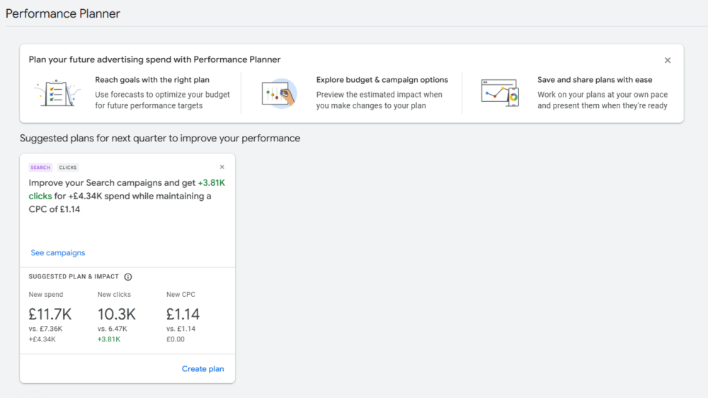 Google zveřejnil novou nápovědu, kterou v mezičase ale stihl odstranit, která podrobně popisovala Doporučené plány v Plánovači výkonu. Tato funkce byla dříve zpozorována u kampaní Performance Max, ale nyní se rozšířila na Search, Shopping a App kampaně.