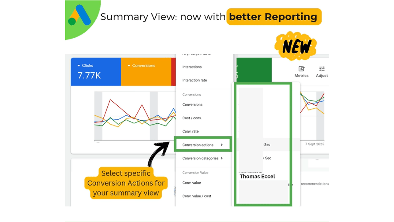 Summary view v Google Ads prošel významným vylepšením, kterého si všiml Thomas Eccel. Inzerenti nyní mohou přizpůsobit své zobrazení výběrem konkrétních konverzních akcí, které se zobrazí přímo na stránce Summary, místo aby se spoléhali na výchozí metriku Konverze nebo Všechny konverze.