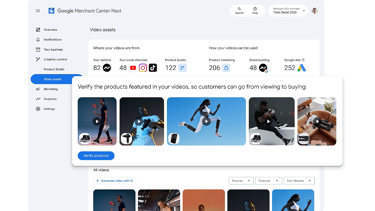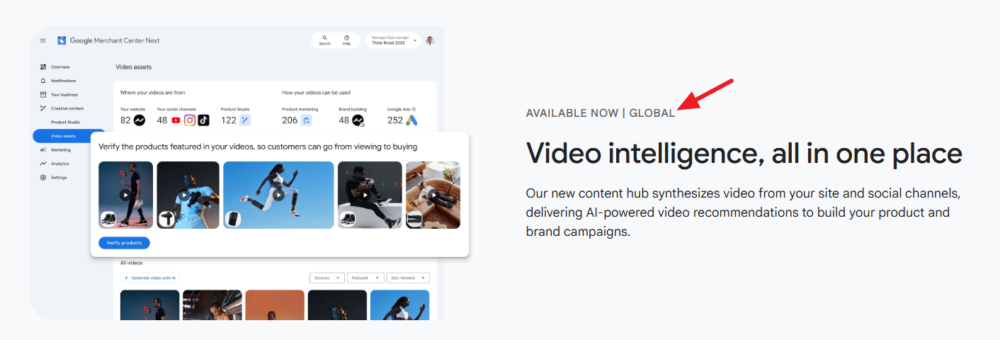 Google spustil sekci video podkladů (Video Assets) globálně v Merchant Center Next, nebo alespoň to oznámil na Think Retails, avšak na tuto sekci jsem ještě osobně nenarazila. Tato funkce konsoliduje video obsah z vašich webových stránek, YouTube a sociálních platforem na jedno místo pro snadnější správu. Videa lze synchronizovat přímo s Google Ads pro použití v kampaních. Video Assets byly představeny na Google Marketing Live 2025.